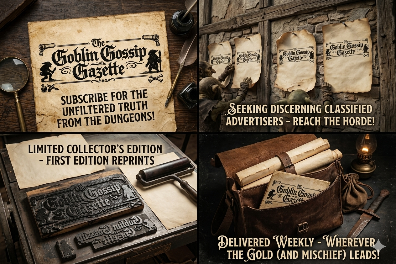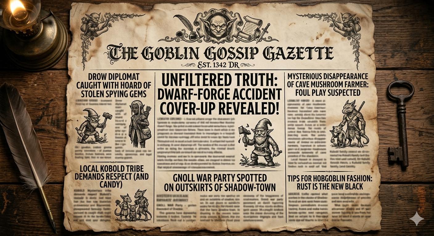 We are creating the Goblin Gossip Gazette, a bi-weekly, physical newspaper designed to be dropped directly onto your gaming table. It’s a living prop, each issue is packed with story hooks, plot points written as 'News Articles' that your players can actually investigate.